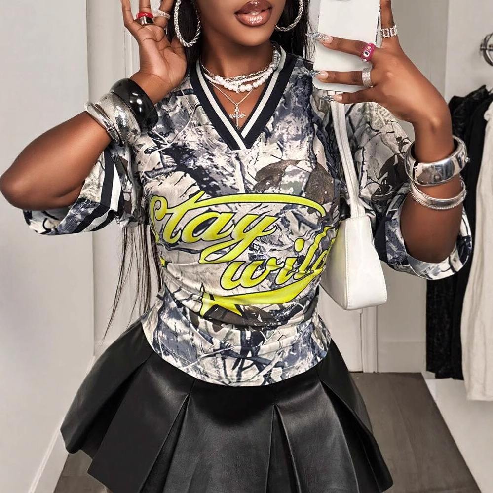 | Product Name | Fashionable and trendy street printed girl's style loose casual V-neck top T-shirt retro short sleeved |