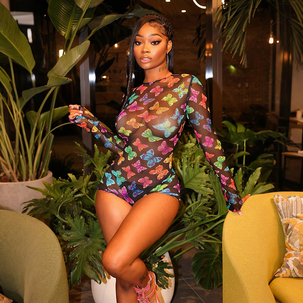 > New sexy backless perspective butterfly print long sleeved jumpsuit for women's shorts